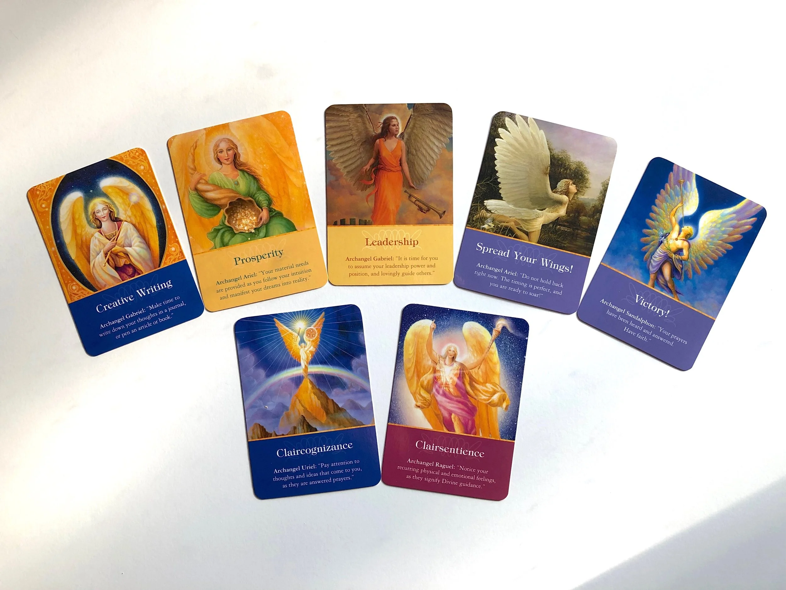 The 7 cards that have been repeating themselves in my readings for many weeks now. No matter how much I shuffle the deck my hand is repeatedly drawn to them. It almost feels like my hand is being held and guided. A very strange sensation. (From the deck “Archangel Oracle Cards” © 2004 by Doreen Virtue.)